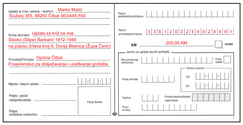 Broj podračuna je: 3381202254028491 , i pozvati se na ID broj: 4227147160002 ,s naznakom: Primatelj – Općina Čitluk, a svrha doznake je za »Postavljanje križeva«.