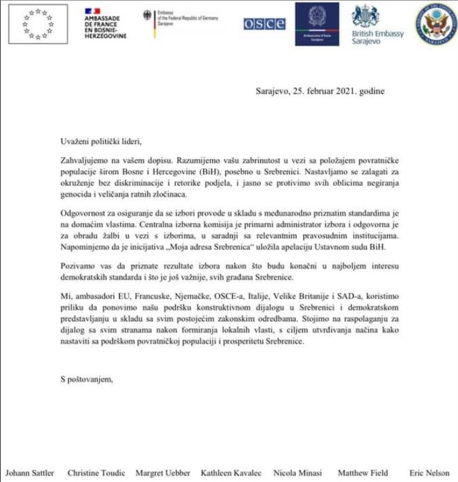 U njemu su se veleposlanici “zahvalili na dopisu” i naveli kako “razumiju zabrinutost u vezi s položajem povratničke populacije širom BiH, posebno u Srebrenici”, te naglasili kako se “nastavljaju zalagati za okruženje bez diskriminacije i retorike podjela i jasno se protive svim oblicima negiranja genocida i veličanja ratnih zločina”.