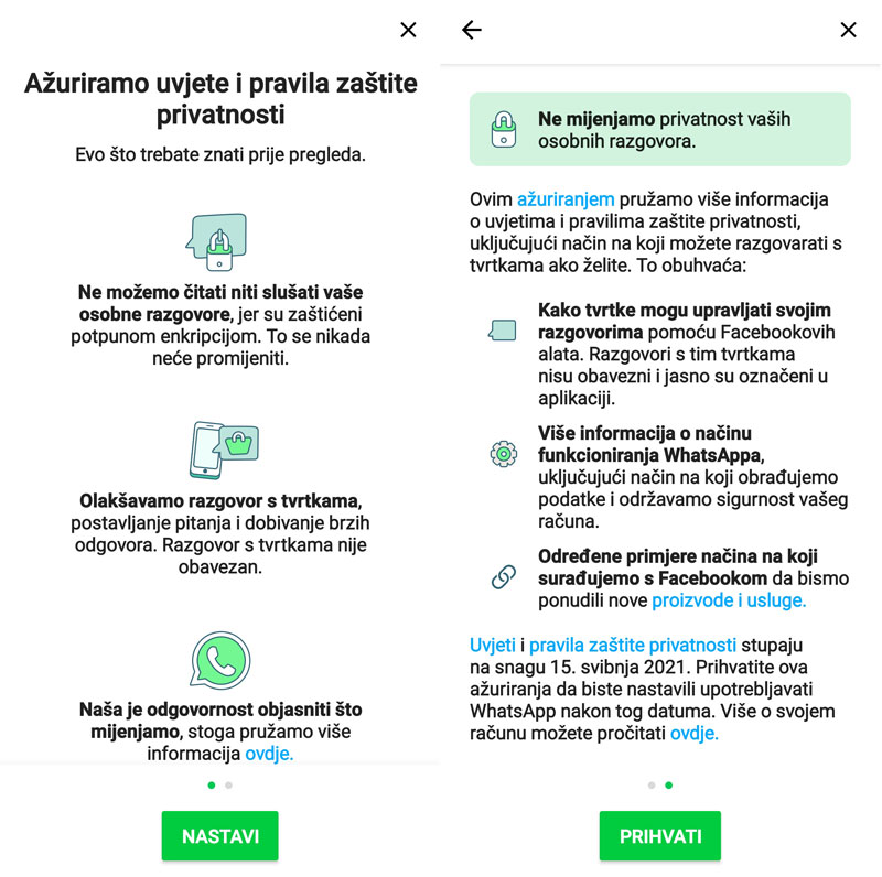 Osobne poruke će uvijek biti zaštićene, tako da ih WhatsApp ne može čitati ili slušati. U sljedećih nekoliko tjedana u WhatsAppu ćemo postaviti poveznicu koja će korisnicima pružiti više informacija i koje mogu proučiti kad njima odgovara. Također, uključili smo više informacija kako bismo pokušali odgovoriti na sva pitanja koja smo čuli. S vremenom, počet ćemmo podsjećati ljude da pogledaju i prihvate te promjene kako bi nastavili koristiti WhatsApp, stoji u objavi.