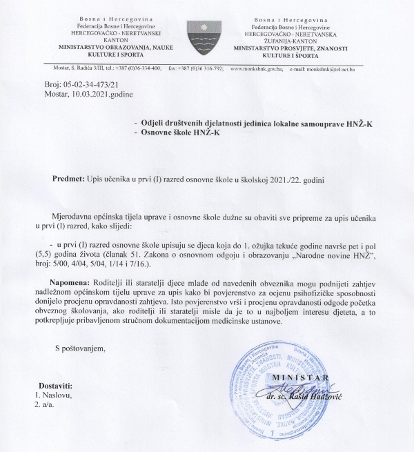 Ministarstvo prosvjete, znanosti, kulture i športa HNŽ uputilo je odjelima društvenih djelatnosti jedinica lokalne samouprave i osnovnim školama na području HNŽ obavijest o upisu učenika u prvi razred osnovne škole u školskoj 2021./2022. godini.