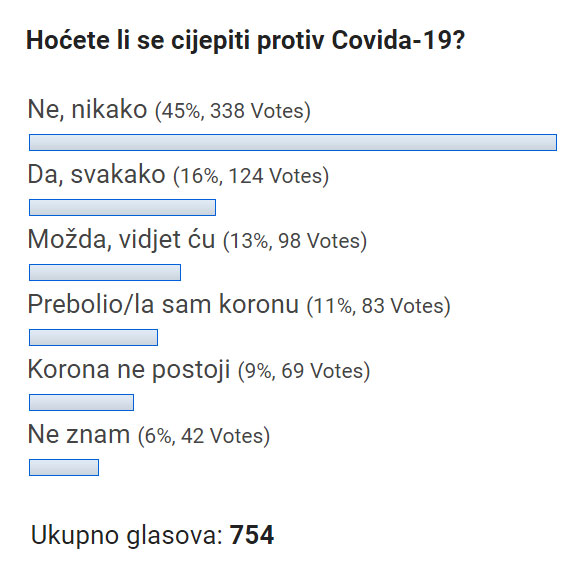 Većina njih, 338 ili 45% na pitanje „Hoćete li se cijepiti protiv Covida-19?“ odgovirila je ne, nikako.