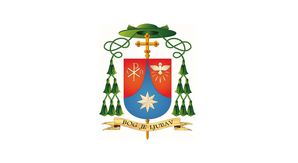 Na heraldički desnom crvenom zastoru nalazi se Kristogram ΧΡ između grčkih slova alfa i omega, koja označavaju Krista Božjega pomazanika. Na heraldički lijevom crvenom zastoru nalazi se golub sa sedam zraka, kao simbol Duha Svetoga i sedam njegovih darova koje biskup dijeli sakramentom svete krizme.