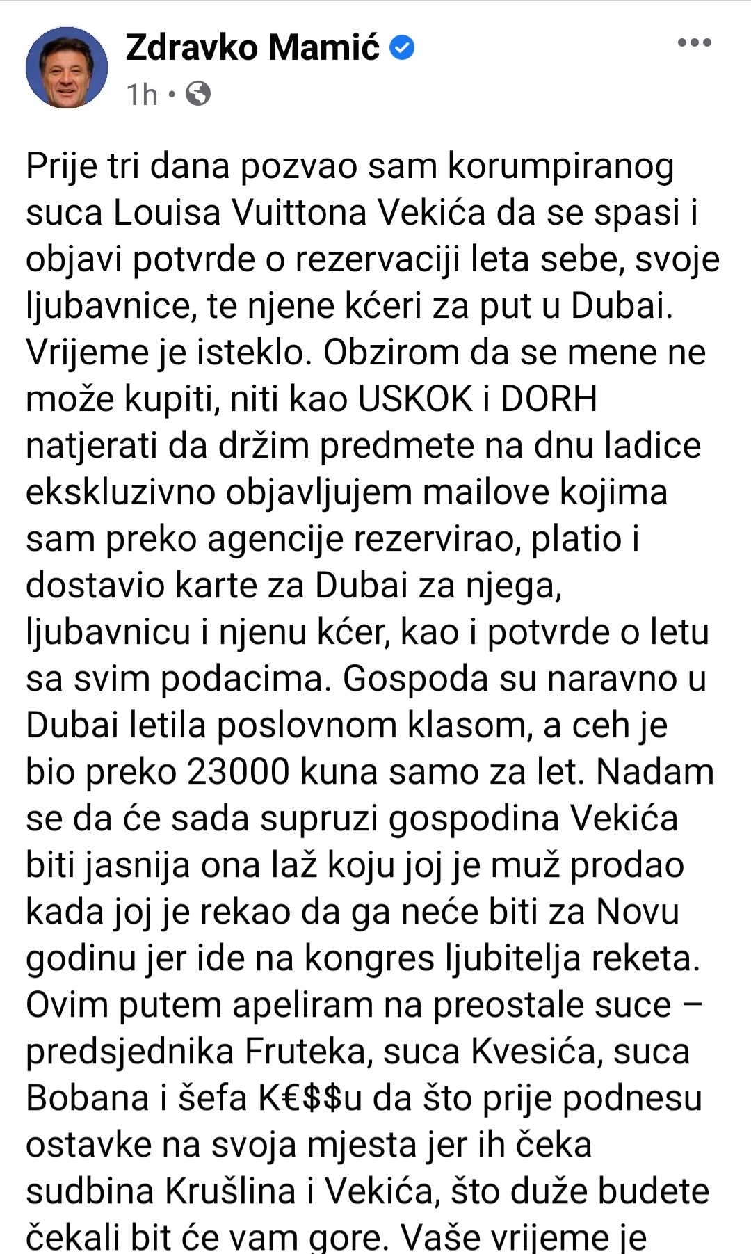 “Prije tri dana pozvao sam korumpiranog suca Louisa Vuittona Vekića da se spasi i objavi potvrde o rezervaciji leta sebe, svoje ljubavnice, te njene kćeri za put u Dubai. Vrijeme je isteklo. Obzirom da se mene ne može kupiti, niti kao USKOK i DORH natjerati da držim predmete na dnu ladice ekskluzivno objavljujem mailove kojima sam preko agencije rezervirao, platio i dostavio karte za Dubai za njega, ljubavnicu i njenu kćer, kao i potvrde o letu sa svim podacima. Gospoda su naravno u Dubai letila poslovnom klasom, a ceh je bio preko 23000 kuna samo za let. Nadam se da će sada supruzi gospodina Vekića biti jasnija ona laž koju joj je muž prodao kada joj je rekao da ga neće biti za Novu godinu jer ide na kongres ljubitelja reketa. Ovim putem apeliram na preostale suce – predsjednika Fruteka, suca Kvesića, suca Bobana i šefa K€$$u da što prije podnesu ostavke na svoja mjesta jer ih čeka sudbina Krušlina i Vekića, što duže budete čekali bit će vam gore. – napisao je Mamić uz objavu preslika potvrda o rezervaciji karata.