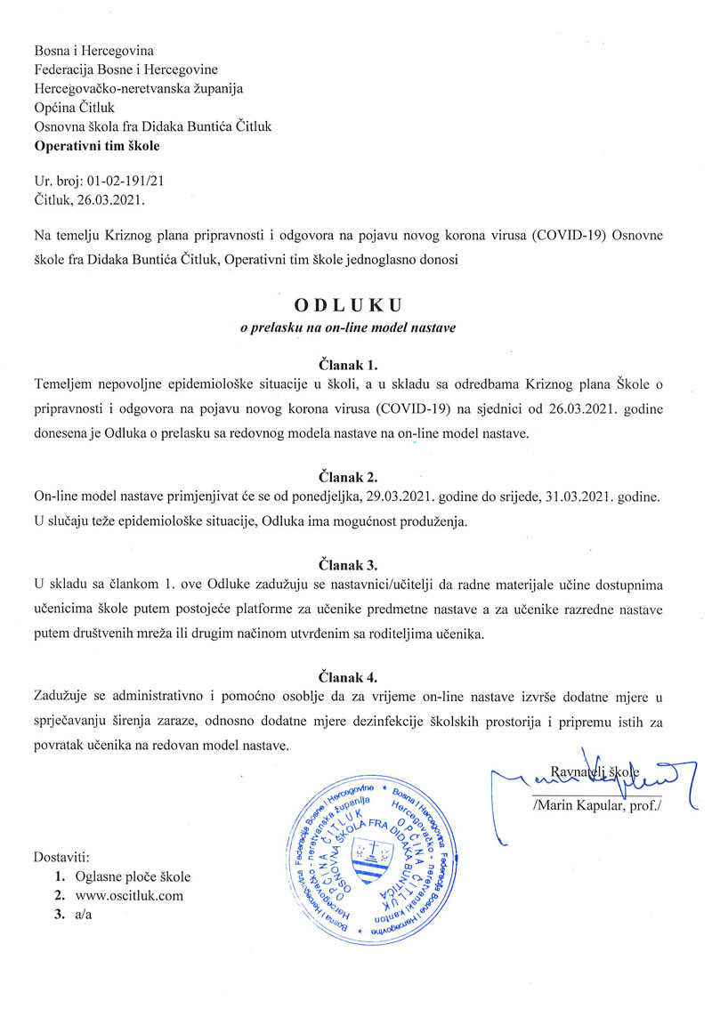 Operativni tim i uprava Osnovne škole fra Didaka Buntića Čitluk u skladu sa Kriznim planom Škole o pripravnosti i odgovora na pojavu novog korona virusa, a zbog nepovoljne epidemiološke situacije u školi donosi Odluku o prelasku na online model nastave.