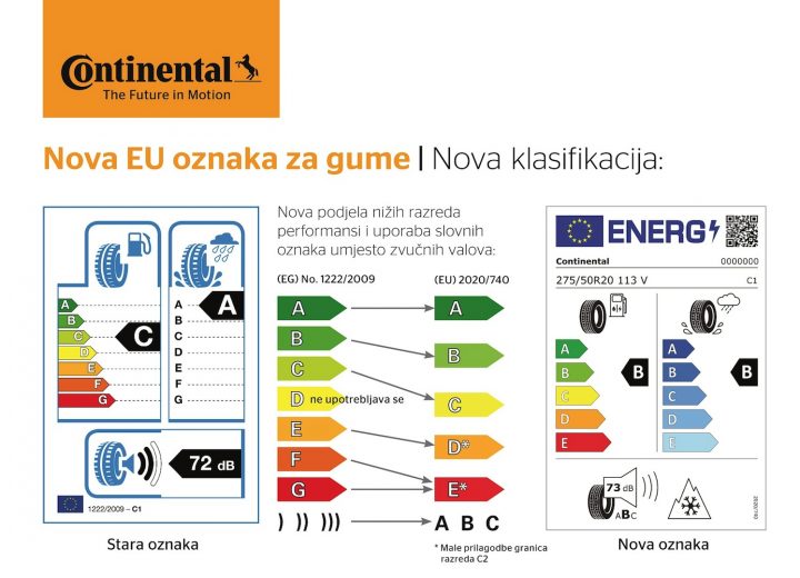 U novoj oznaci restrukturirani su razredi otpora kotrljanja i performansi kočenja u mokrim uvjetima, a proizvodnja buke odsad će biti označena brojem decibela i slovima A, B ili C – piše RevijaHAK.hr.