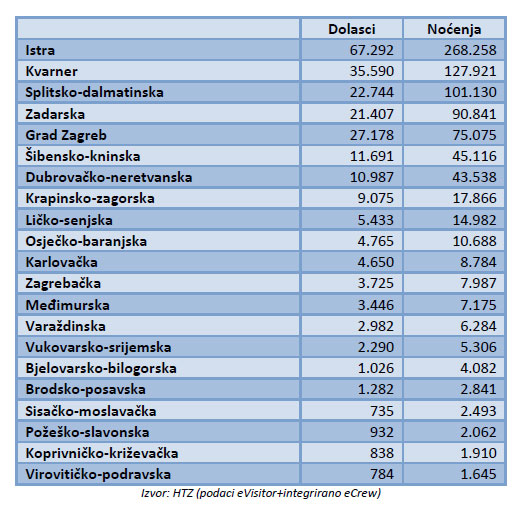 U apsolutnim brojkama, najveći promet turista tijekom travnja (mjereno noćenjima) ostvaren je na području Istre, a potom slijede Kvarner i Splitsko-dalmatinska županija.