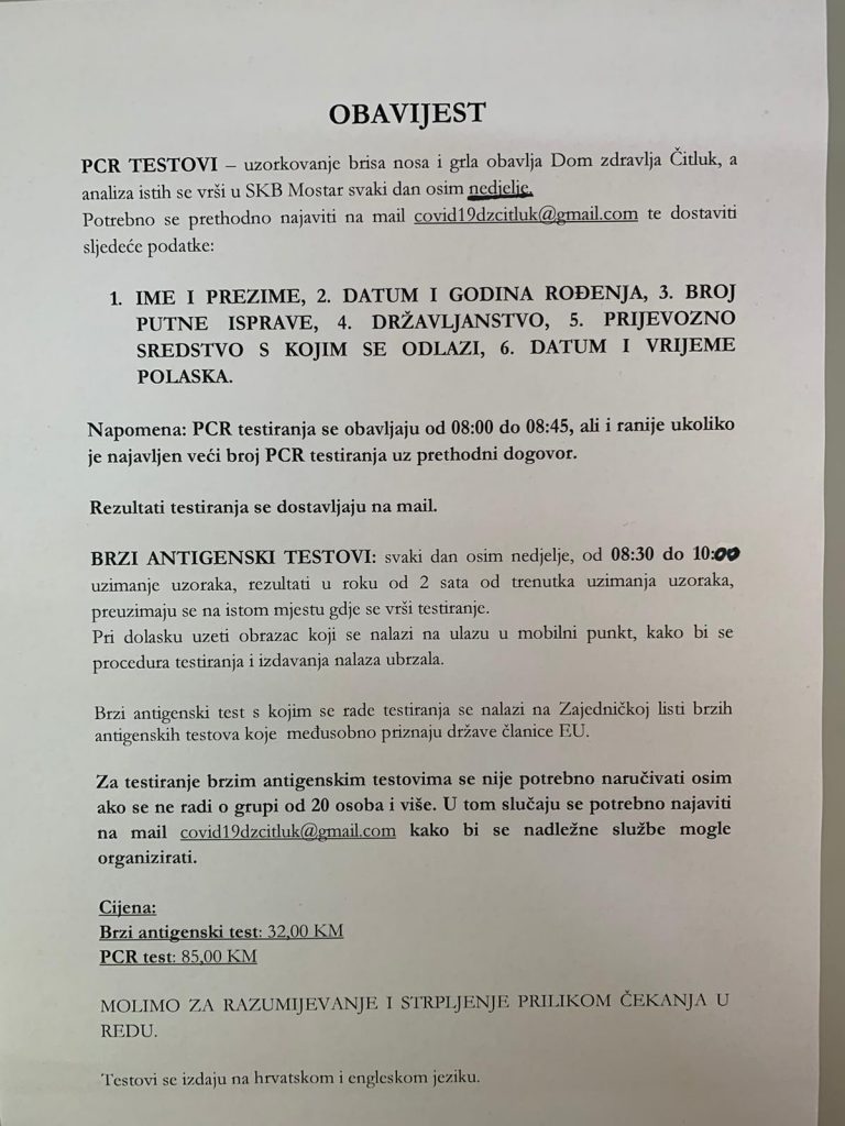 PCR TESTOVI – uzorkovanje brisa nosa i grla obavlja Dom zdravlja Čitluk, a analiza istih vrši se u SKB Mostar svaki dan osim nedjelje. Potrebno se prethodno najaviti na mail [email protected] te dostaviti sljedeće podatke:
