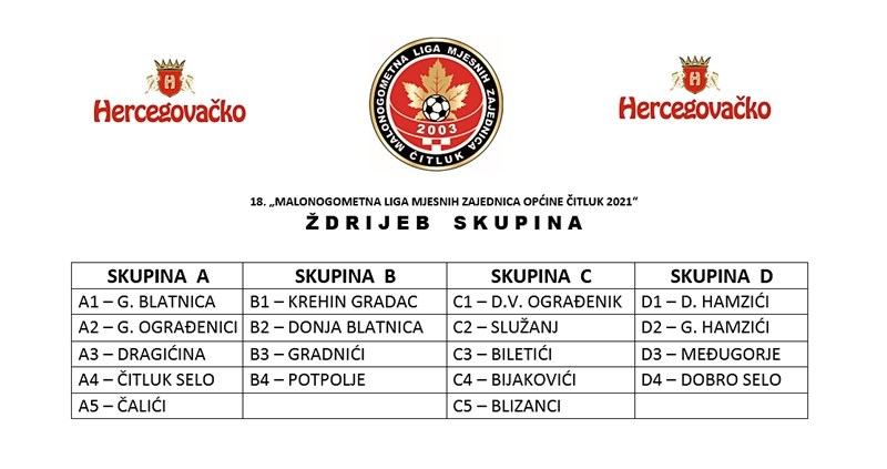 Sinoć je u hotelu Brotnjo održan ždrijeb skupina 18. izdanja Malonogometne lige mjesnih zajednica općine Čitluk – Brotnjo 2021. Početak natjecanja najavljen je za 19. srpnja, a osamnaest momčadi mjesnih zajednica koje su se prijavile za natjecanje ždrijebom je podijeljeno u četiri skupine.
