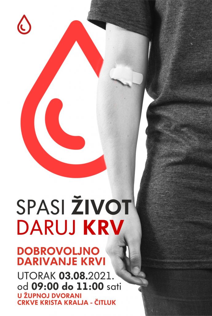 Odjel za transfuziologiju KBC-a Mostar, Crveni križ Čitluk i Franjevački svjetovni red Čitluk i ove godine organiziraju dobrovoljno darivanje krvi koje će se održati u utorak 03. kolovoza 2021. u vremenu od 09 do 11 sati.