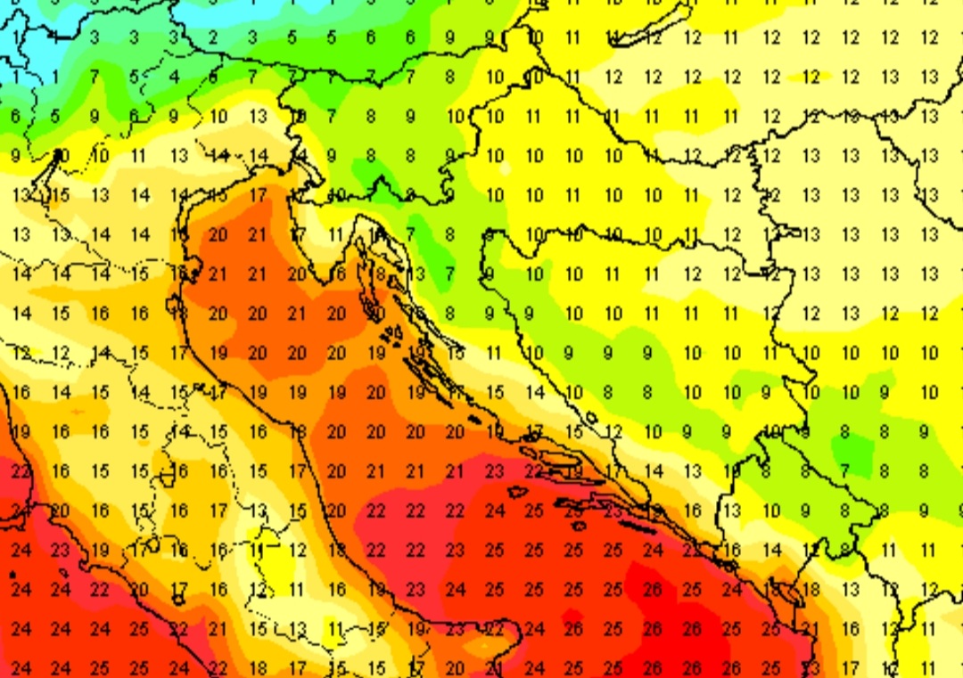 Na Jadranu, jugu, zapadu i jugoistoku Hercegovine dnevne temperature zraka kretati će se uglavnom od 19°C do 25°C, a noćne i jutarnje od 14°C do 19°C.