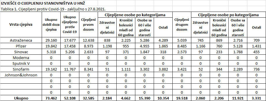 U pripadajućoj tablici ZJZ-a HNŽ-a navedeno je kako je u HNŽ-u ukupno pristiglo 73.462 doze cjepiva, od čega 29.160 AstraZeneca, 19.842 Pfizera, 19.142 Sinofarma i 5318 Sinovaca.