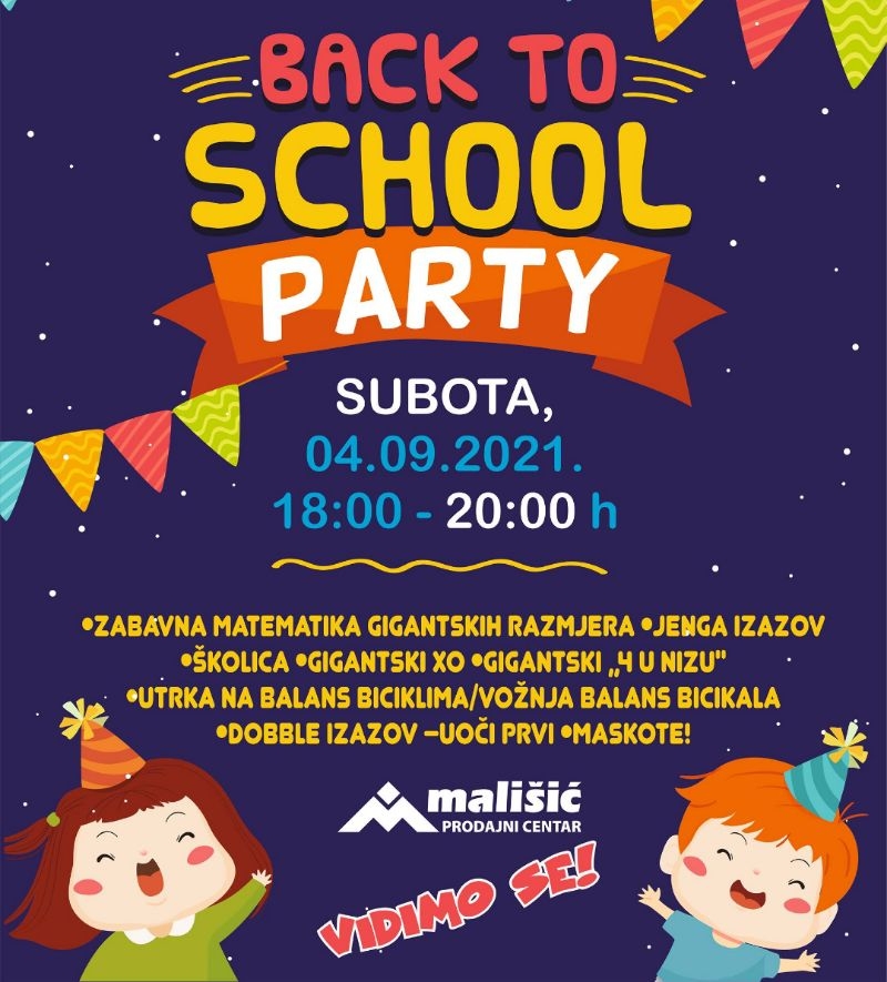 *Dječja zabava „Back to school“ od 18:00 – 20:00 sati uz omiljene maskote, zabavnu matematiku gigantskih razmjera, utrku na balans biciklima, double izazov i druge zabavne igre..