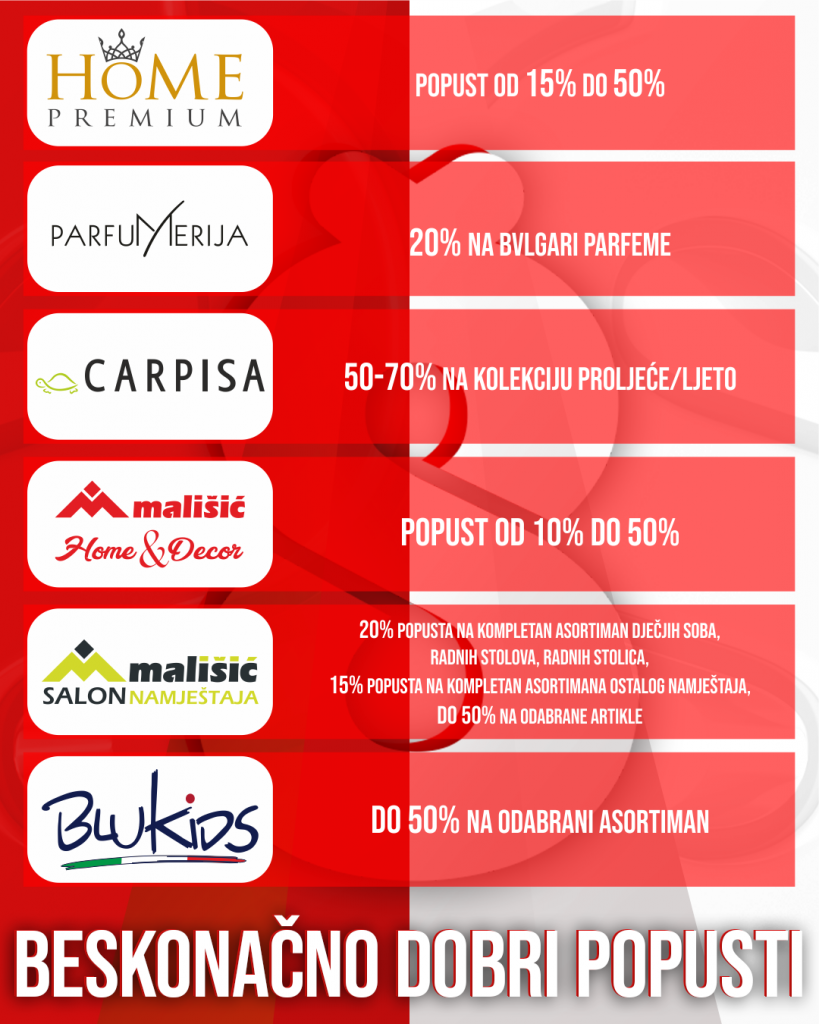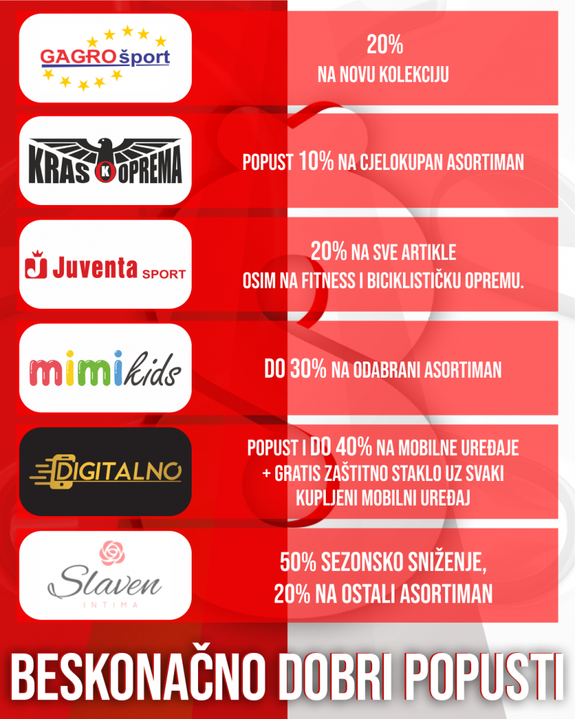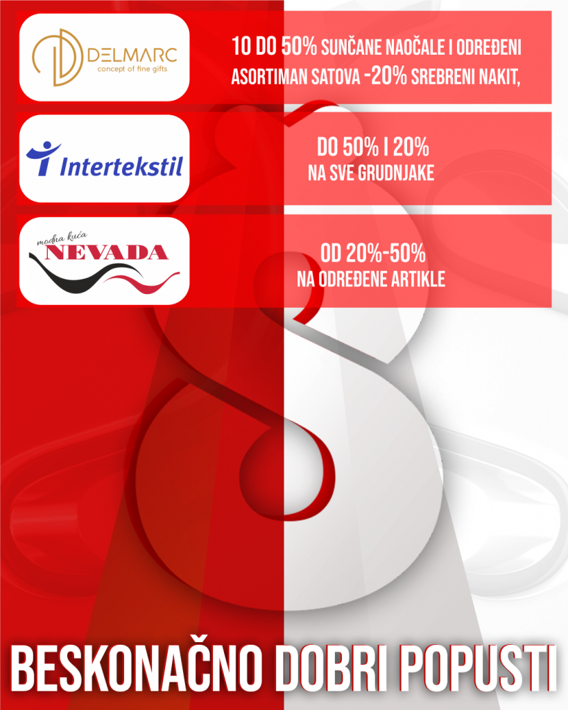 Svakog mjeseca povodom Sretne osmice naši zakupci pripremaju odlične popuste i pogodnosti.