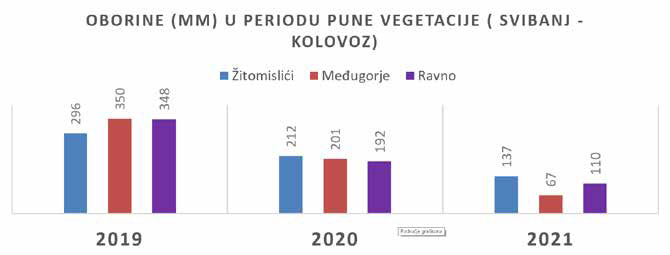Na grafu se jasno vidi da je količina oborina u periodu svibanj-kolovoz 2021. god. bila dva puta manja u usporedbi s 2020., a trostruko manja od 2019. godine. Najveće oscilacije su bile u svibnju2021. koji je bio sušniji od višegodišnjeg prosjeka (40-80 lit kiše zavisno od lokaliteta).Ovo je jedan od razloga zašto nije bilo ozbiljnijih problema s plamenjačom. Tijekom srpnjana ove tri meteopostaje zabilježenoje od 10 do 20 lit kiše. Suša se nastavila i kroz kolovoz sve do treće dekade kada smo imali u nekoliko navrata kišu (30 – 35 lit) i na sreću ove godine nismo zabilježili značajnije štete od tuče i poplave. Mladi vinogradi i vinogradi u kršu bez navodnjavanja su najviše osjetili sušu u ovoj sezoni.