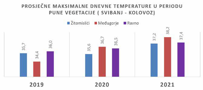 Prosječne maksimalne temperature zraka u periodu svibanj – kolovoz bile su značajno više u 2021. godini na sve tri lokacije. Posebno je ovo bilo izraženo na meteo postaji Međugorje, gdje imamo razliku gotovo 4o C u odnosu na 2019. godinu i 2o C u odnosu na 2020. godinu. Tijekom ljeta 2021. na meteo postaji Međugorje imali smo 42 dana s maksimalnim dnevnim temperaturama iznad 35o C, a 8. kolovoza zabilježena je najviša temperatura 41o C. U takvim uvjetima, bez vlage u tlu, poljoprivredne kulture ulaze u stanje toplinskog stresa koji značajno utječe na sve fiziološke procese u biljci. Ovo se posebno moglo prepoznati u vinogradima na kršu bez navodnjavanja, ali i na plićim tlima u polju. U ovakvim ekstremno suhim i toplim godinama izražena je pojava naglog sušenja trsova koji imaju problema s bolestima drveta (primarno Esca i Eutipa).