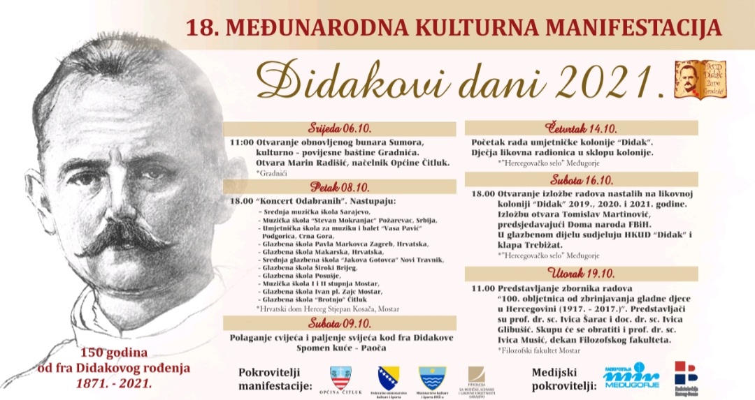 Osamnaesti po redu Didakovi dani, međunarodna kulturna manifestacija, koju u čast velikog hercegovačkog svećenika, prosvjetitelja i vizionara fra Didaka Buntića, u njegovoj rodnoj župi Gradnići organizira Hrvatsko-kulturno umjetničko društvo Didak ove godine održavat će se kroz šest dana, od 6. do 19. listopada.