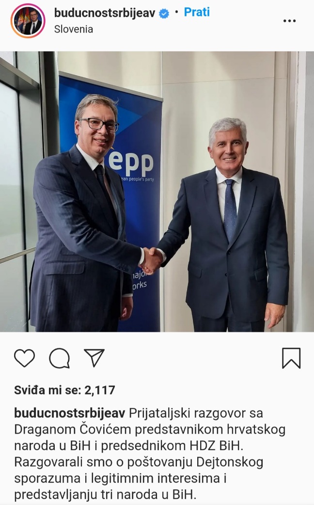 Vučić je na službenom Instagram profilu “budućnostsrbijeav” objavio kako je imao prijateljski razgovor s Draganom Čovićem, predstavnikom hrvatskog naroda u Bosni i Hercegovini i predsjednikom HDZ-a BiH.