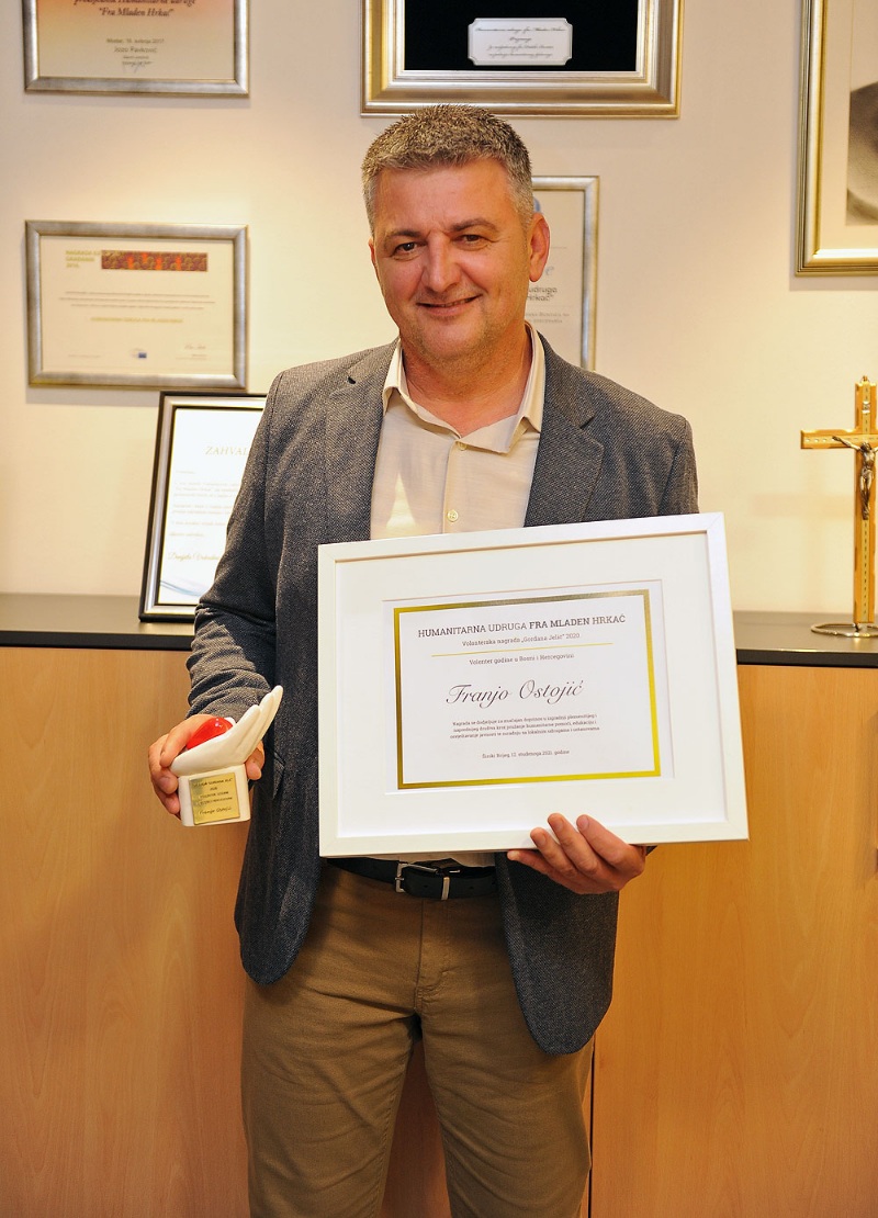 Nagradu je prošlogodišnjem dobitniku ovog vrijednog volonterskog priznanja Franji Ostojiću iz Čitluka uručio predsjednik Udruge Ivan Soldo.