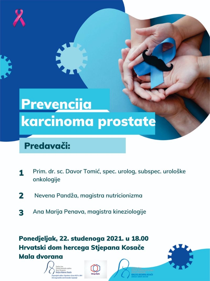 Predavači su prim. dr. sc. Davor Tomić, spec. urolog, subspec. urološke onkologije, magistra nutriocionizma Nevena Pandža i magistra kineziologije Ana Marija Penava. Predavanje će se održati u Hrvatskome domu hercega Stjepana Kosače u 18 h. Moderatorica programa bit će Antonela Vučić.