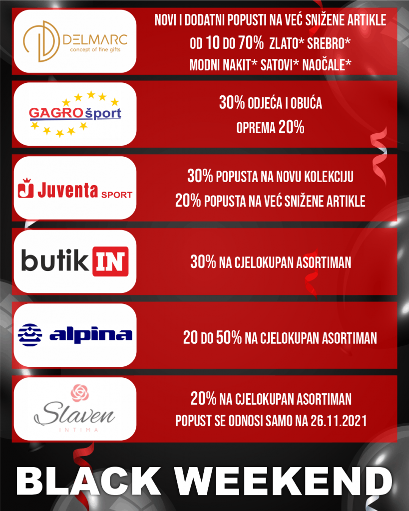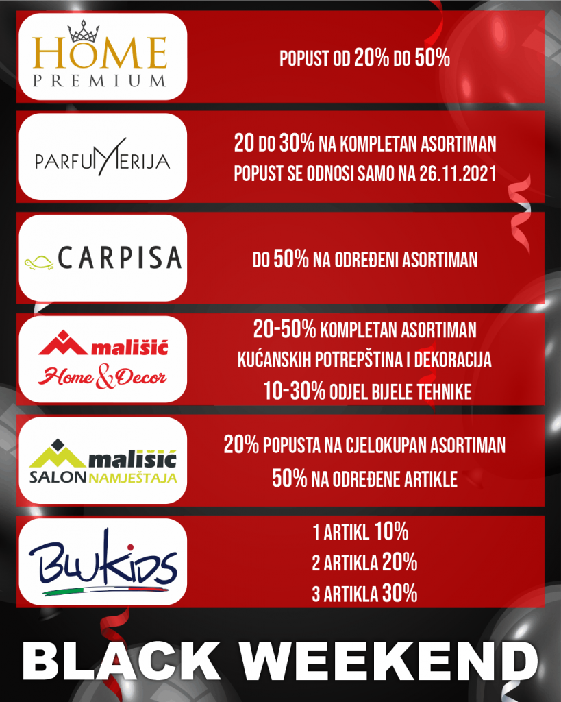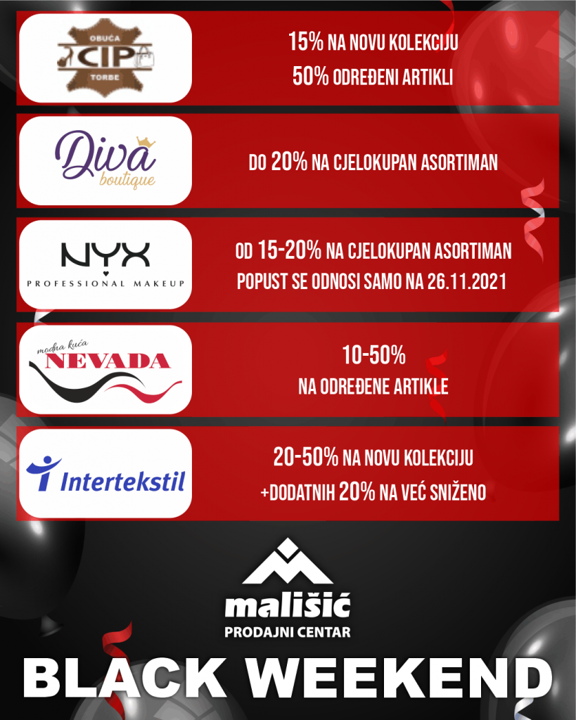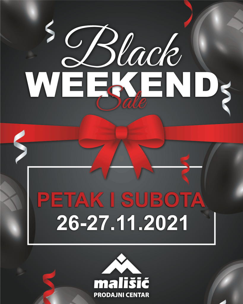 Cijenjeni kupci, ovog petka i subote, 26.i 27.11.neka vaš odabir shopping destinacije bude prodajni centar Mališić Međugorje jer pred nama je BlackWeekendSale uz odlične akcijske popuste i pogodnosti u trgovinama.