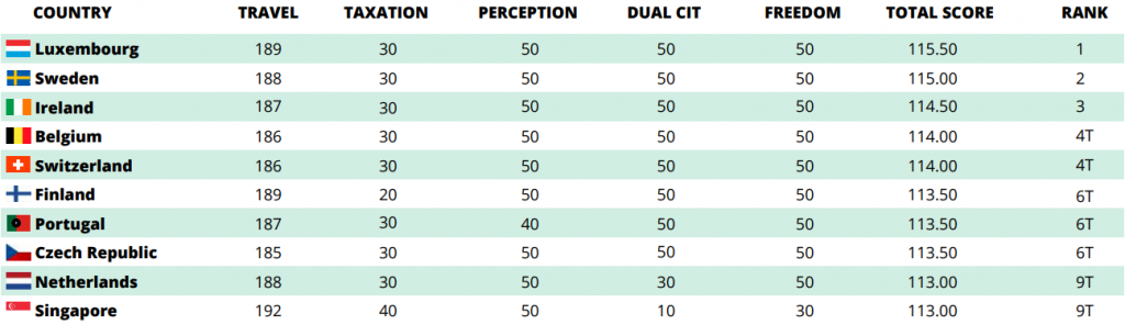 Što se tiče porezne politike prilikom rangiranja, minimalnih deset bodova dodijeljeno je državama, odnosno putovnicama, u kojima je oporezivanje rigorozno, kao što je slučaj kod SAD-a. Maksimalnih 50 bodova dodijeljeno je državama koje minimalno oporezuju, poput Monaka i Saudijske Arabije.