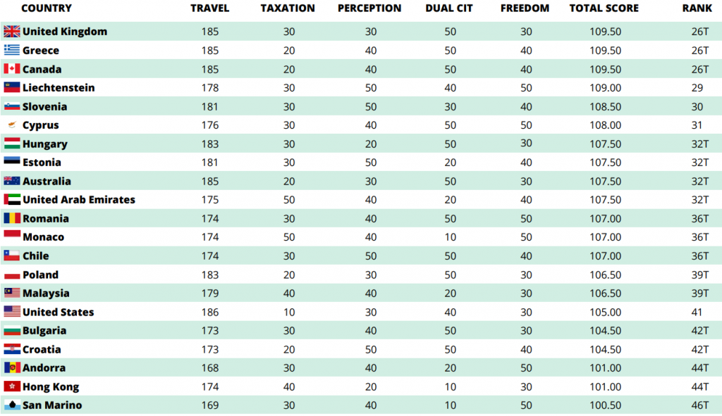 Hrvatska s Bugarskom dijeli 42. mjesto. Hrvatska putovnica dobila je maksimalan broj bodova za globalnu percepciju i mogućnost dobivanja dvojnog državljanstva, a najmanje bodova za poreze.