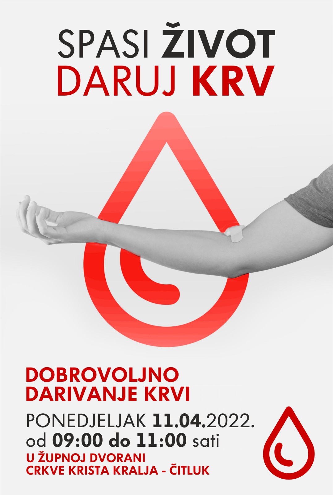 Franjevački svjetovni red Čitluk u suradnji sa odjelom za transfuziologiju KBC-a Mostar i Crvenim križem Čitluk organiziraju akciju dobrovoljnog darivanja krvi koje će se održati u ponedjeljak 11. travnja 2022. u vremenu od 09 do 11 sati u župnoj dvorani crkve Krista Kralja u Čitluku.