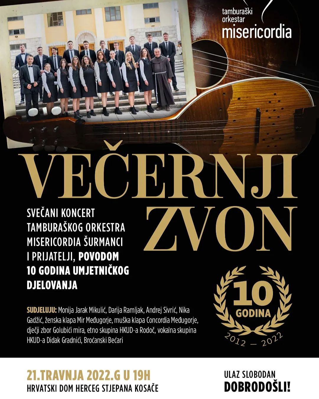 ”Mi smo ga i ovaj put nazvali Večernji zvon, jubilarni je to deseti Večernji zvon 2022. Ovaj put smo ga zamislili nešto drugačije kako bismo prikazali širok spektar djelovanja tambure. Kroz koncert ćemo prikazati neke skladbe umjetničke tamburaške glazbe pisane isključivo za veliki tamburaški orkestar, nekih obrada, do tamburaške glazbe koja prati folklor”, kazao je voditelj Tamburaškog orkestra Misericordia je profesor glazbe Damir Markota, najavivši kako će na koncertu nastupiti i pjevač duhovne glazbe Stijepo Gleđ Markos, a uz njega na ovom koncertu još sudjeluju: Monija Jarak Mikulić, Darija Ramljak, Andrej Sivrić, Nika Gadžić, ženska klapa Mir Međugorje, muška klapa Concordia Međugorje, dječji zbor Golubići mira, etno skupina HKUD-a Rodoč, vokalna skupina HKUD-a Didak Gradnići, Broćanski bećari…