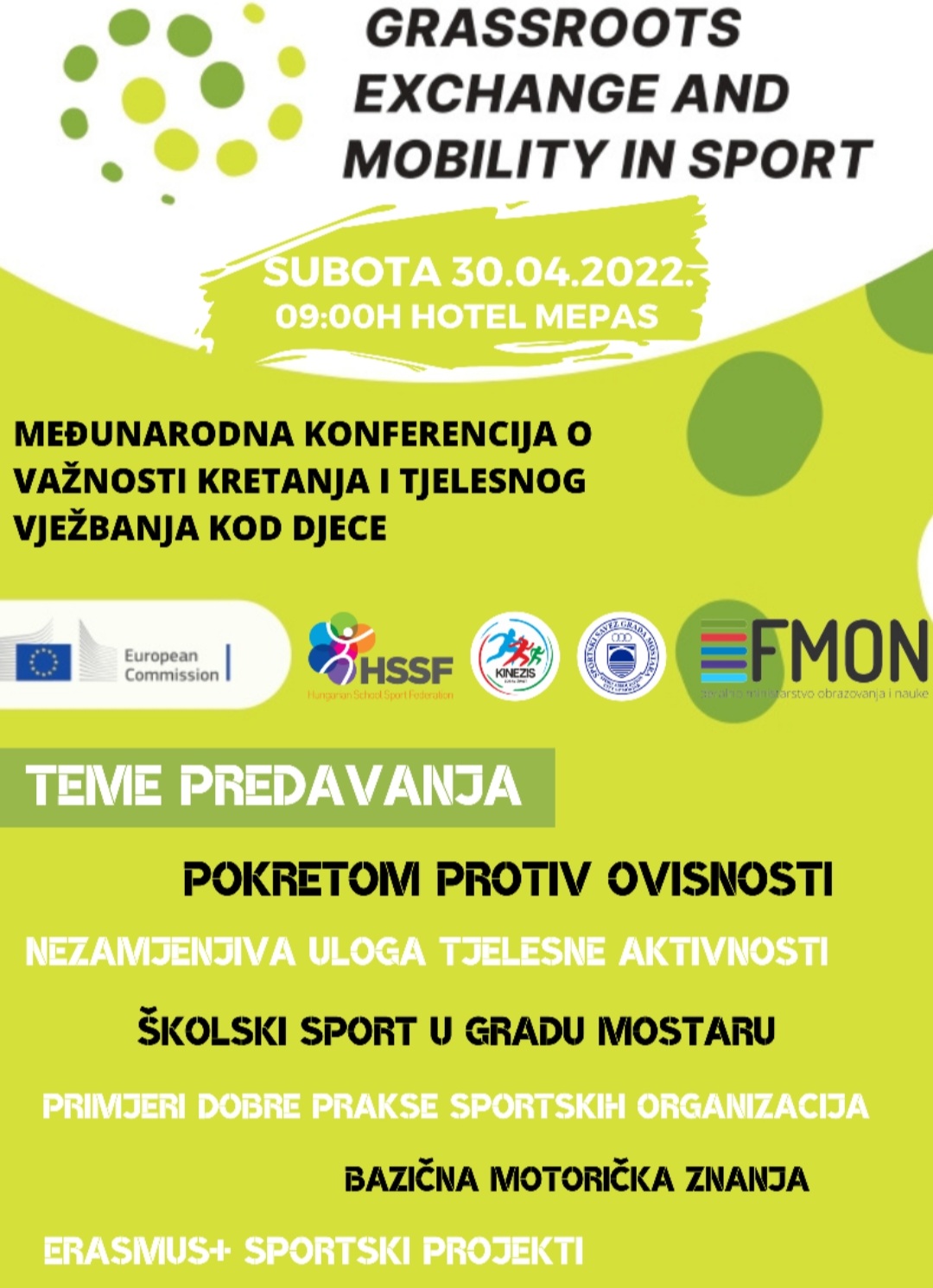 Udruga Zdrav život KINEZIS poziva sve nastavnike tjelesne i zdravstvene kulture, sportske trenere, kao i sve sportske udruge na Znanstveno-stručnu konferenciju o važnosti kretanja i tjelesnog vježbanja kod djece, koja će se u sklopu međunarodnog Erasmus + projekta “Grassroots exchange and mobility (GEM) – empowering youth sport professionals” održati u subotu 30.04.2022. od 09.00-11.00h u kongresnoj dvorani “Princess” hotela Mepas u Mostaru.