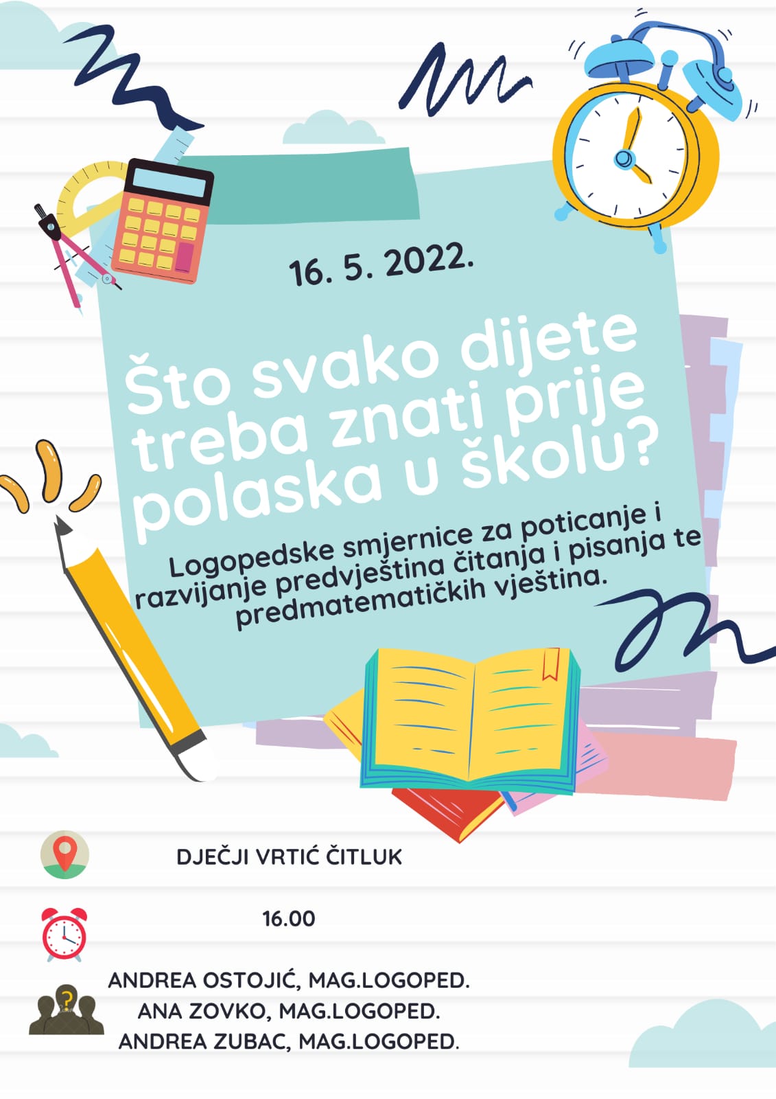 Edukativno predavanje održat će se u ponedjeljak, 16. svibnja s početkom u 16 sati u Dječjem vrtiću Čitluk. O znanjima i vještinama kojima dijete treba vladati prije polaska u školu zainteresiranim roditeljima govorit će magistrice logopedije Andrea Ostojić, Ana Zovko i Andrea Zubac, koje navedeno predavanje pripremaju u suradnji s Majom Mustapić, ravnateljicom Osnovne škole za djecu s posebnim potrebama.