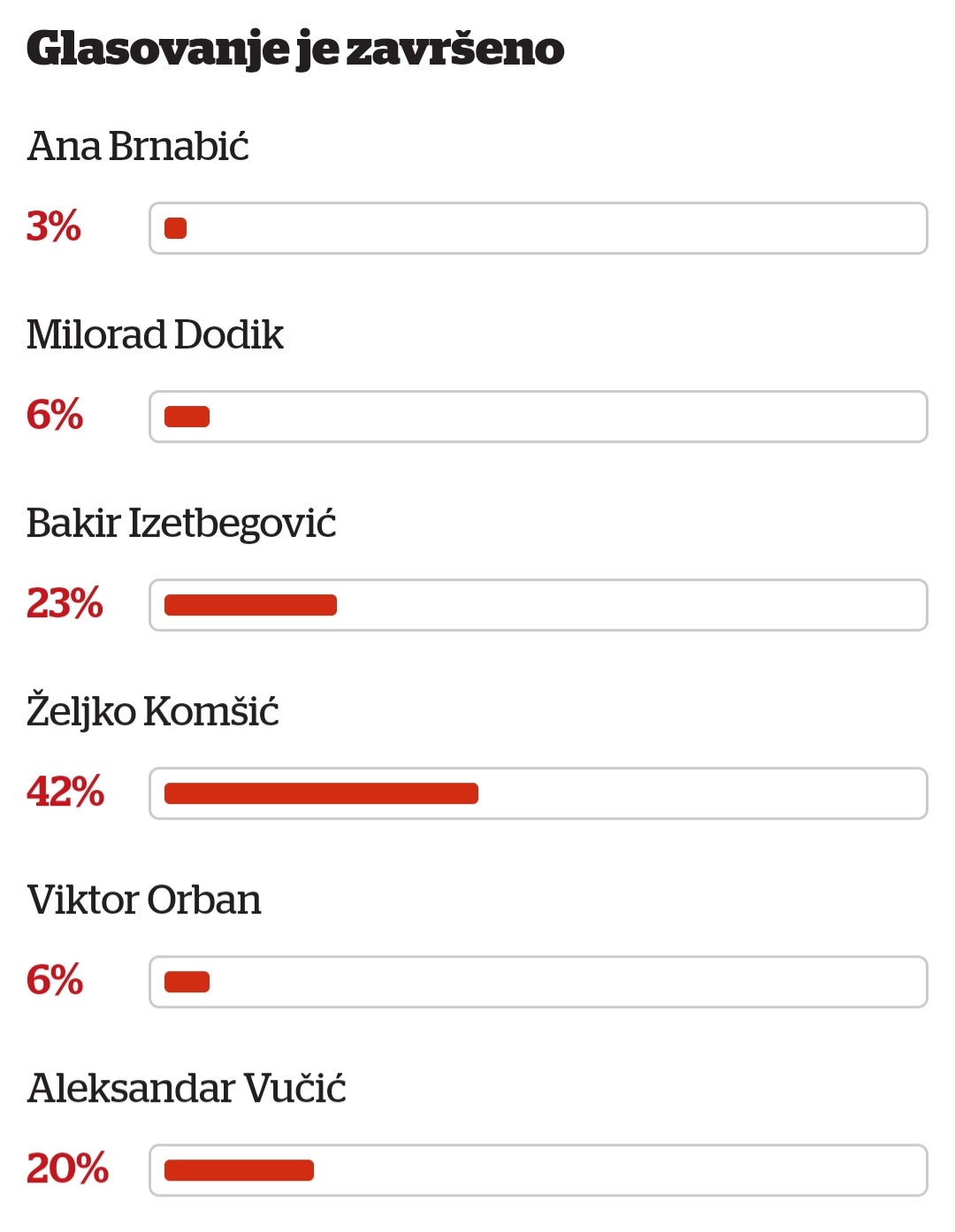 Zanimljivo je da su mađarski premijer Viktor Orban i srpski član Predsjedništva BiH Milorad Dodik dobili isti postotak, po šest posto.