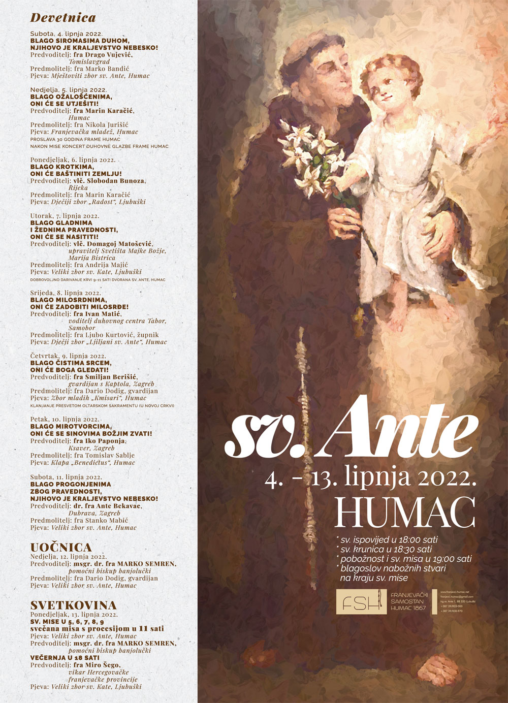 „To blago pohranjeno je u našim srcima, a ako je izblijedilo, zaprljano ili duboko zakopano, potrebno je iznova ga otkriti, kako bismo od tog blaga, koje je istina u glinenim posudama, živjeli i kako bi nam dalo snage za ići naprijed kroz život s Božjom pomoći. Ta blaženstva Isus stavlja u najteže situacije da se ne prepadnemo, ne pokleknemo, nego da kroz sve nevolje idemo naprijed za Gospodinom, kao što je išao i sv. Ante. Već 30 godina naši mladi na Humcu otkrivaju važnost tog blaga sakrivenog u evanđelju. Okupljeni u FRAMI, kao najstarije bratstvo u Bosni i Hercegovini, upravo u ovoj Devetnici slave veliki jubilej: 30 godina postojanja. Zahvalni Bogu za svaki njihov rad, trud i pomoć ovim im putem čestitamo na tom velikom događaju i molimo zagovor sv. Franje i našega zaštitinika sv. Ante da ih prate na svakom slijedećem koraku“, navodi se u najavi Devetnice sv. Anti.
