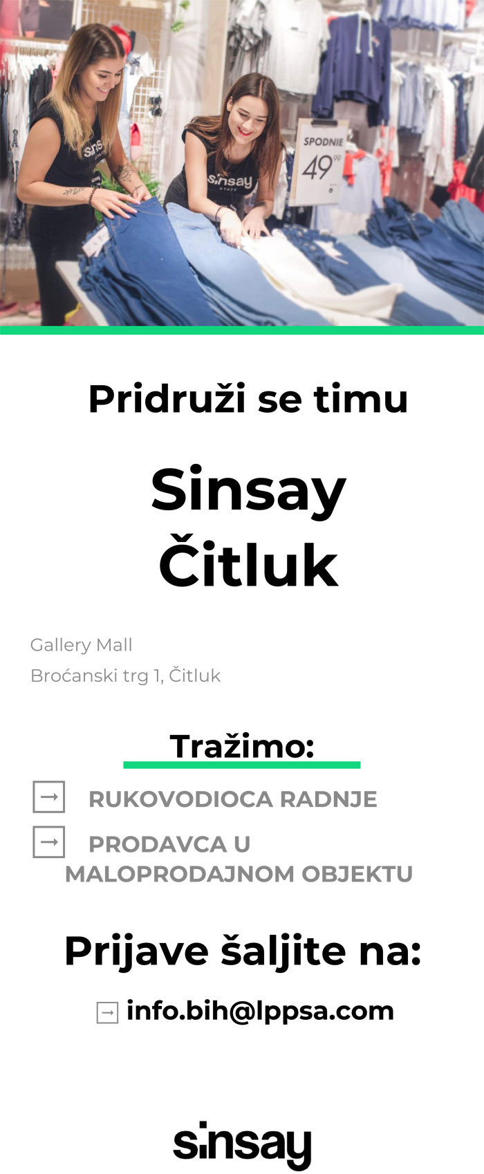 Uskoro otvaramo našu Sinsay radnju u Čitluku, te vas pozivamo da se prijavite za otvorene pozicije: