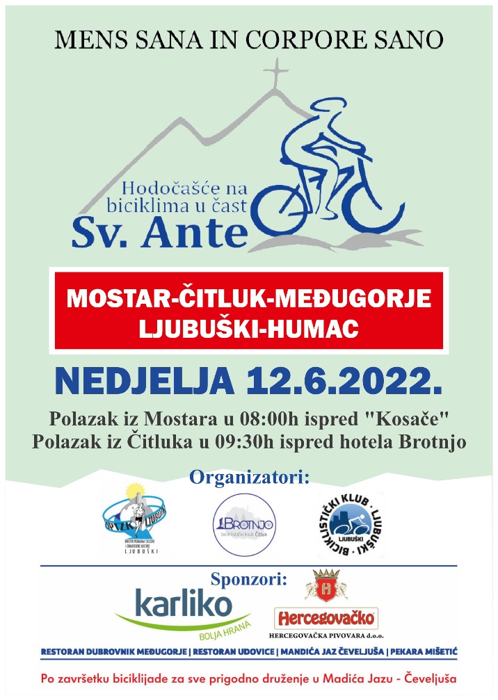 U organizaciji Društva pedagoga TZK Ljubuški, te biciklističkih klubova Brotnjo i Ljubuški u nedjelju 12.6. održati će se 14. tradicionalno biciklističko hodočašće u čast sv. Ante.