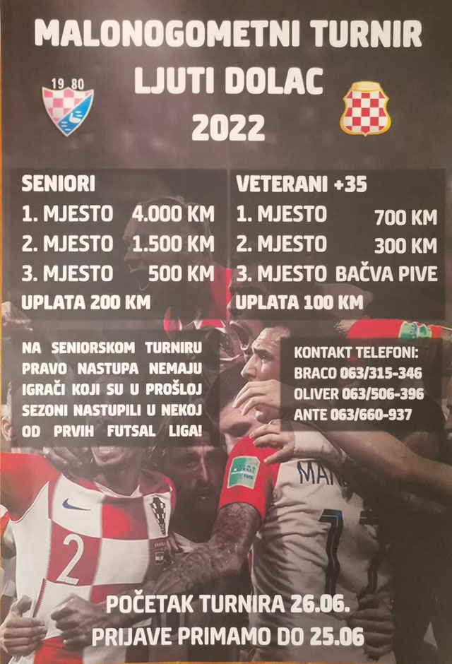 Malonogometni turnir “Ljuti Dolac 2022.” počinje u nedjelju 26. lipnja 2022. Prijave ekipa traju do 25. lipnja 2022.
