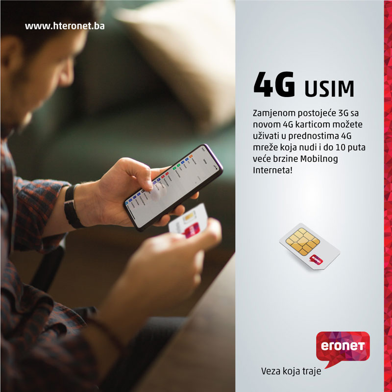 Kako bi i dalje neometano koristili mobilne usluge prilikom posjeta inozemstvu, te kako bi u domaćoj mreži uživali u prednostima brzog interneta u pokretu, korisnicima predlažemo što prije zamijeniti svoje stare kartica za nove 4G/USIM kartice.