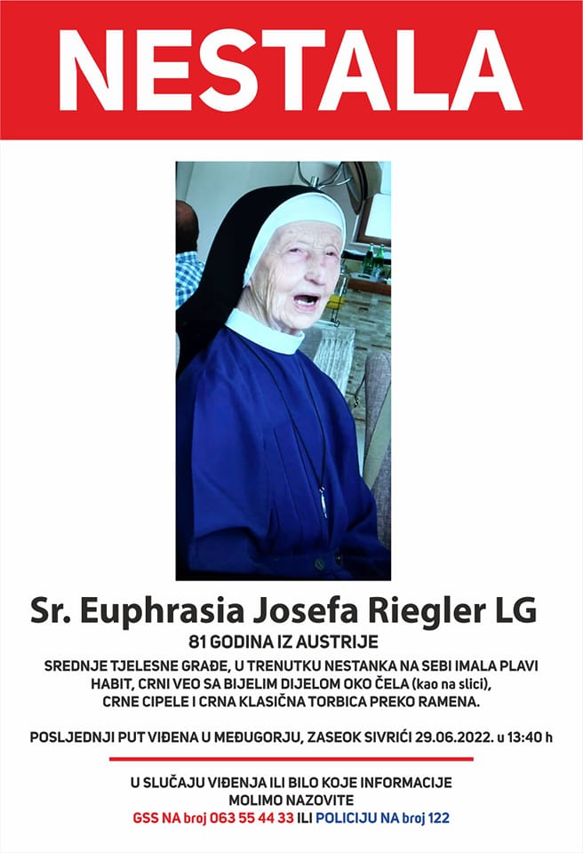 U Međugorju je jučer nestala 81-godišnja časna sestra iz Austrije. Srednje je tjelesne građe, u trenutku nestanka na sebi je imala plavi habit, crni veo sa bijelim dijelom oko čela (kao na slici), crvene cipele i crnu torbicu preko ramena.