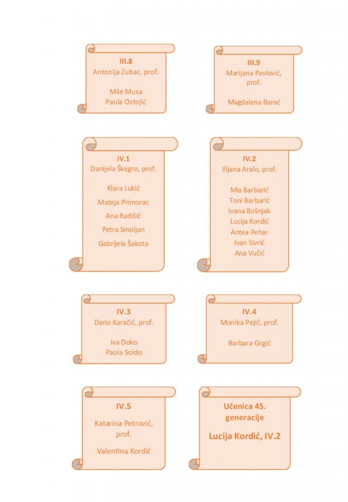 U generaciji su dva odjela opće gimnazije: IV.1, razrednica Danijela Škegro te IV.2, razrednica Ilijana Aralo. Odjel IV.3 su ekonomisti, razrednik je profesor Dario Karačić. Također su dva odjela hotelijersko-turističkih tehničara: IV.4, razrednica Monika Pejić i IV.5, razrednica Katarina Petrović.