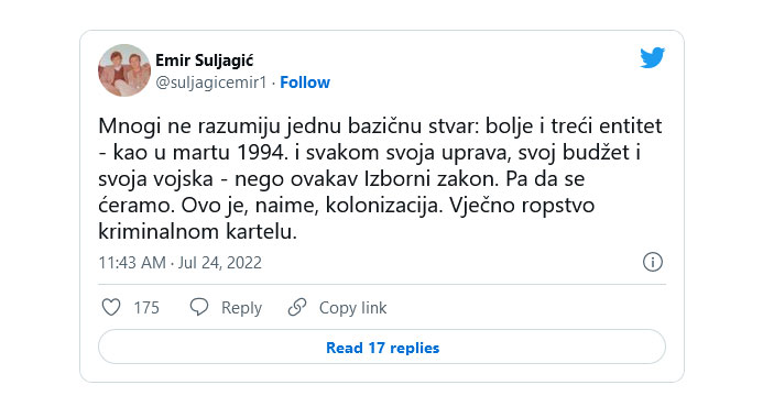 -Mnogi ne razumiju jednu bazičnu stvar: bolje i treći entitet – kao u ožujku 1994. i svakom svoja uprava, svoj proračun i svoja vojska – nego ovakav Izborni zakon. Pa da se ‘ćeramo’. Ovo je, naime, kolonizacija. Vječno ropstvo kriminalnom kartelu, napisao je Suljagić na Twitteru koji je i bivši zamjenik ministra obrane BiH kao dužnosnik Komšićevog DF-a.