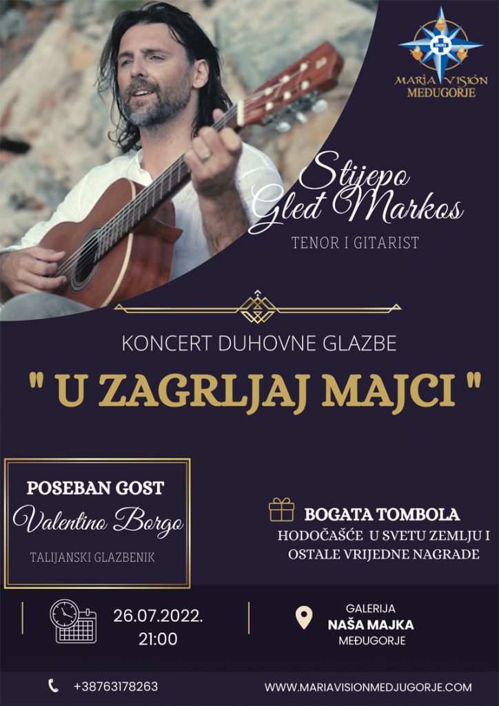 Maria Vision Međugorje u utorak, 26. srpnja s početkom u 21 sat u novootvorenom muzeju Naša Majka u Međugorju, organizira večer duhovne glazbe pod nazivom “U zagrljaj Majci”.