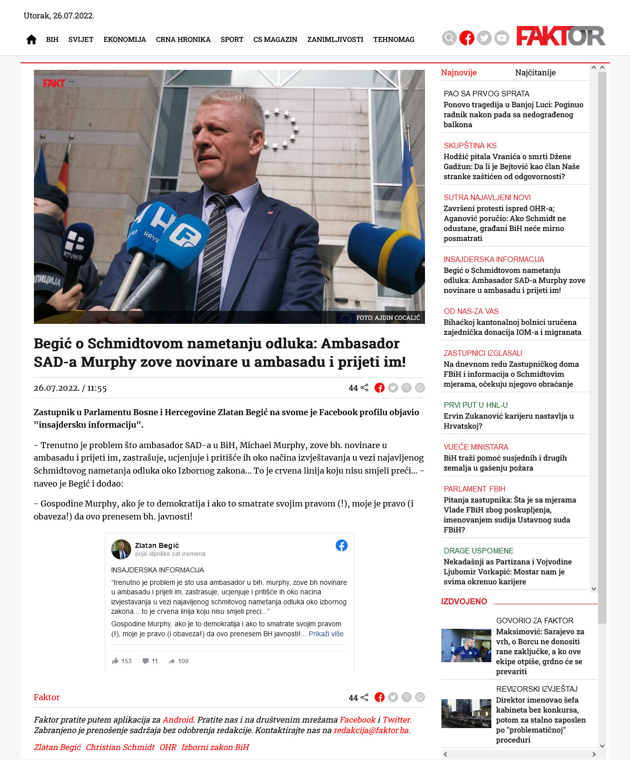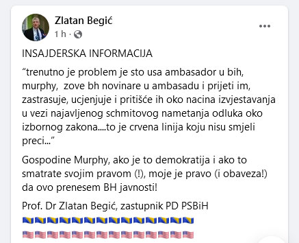 Zastupnik Komšićevog DF-a u Parlamentu BiH Zlatan Begić na svome je Facebook profilu optužio veleposlanika Sjedninjeni Američkih Država (SAD) u BiH Michaela Murphyja za prijetnje novinarima!