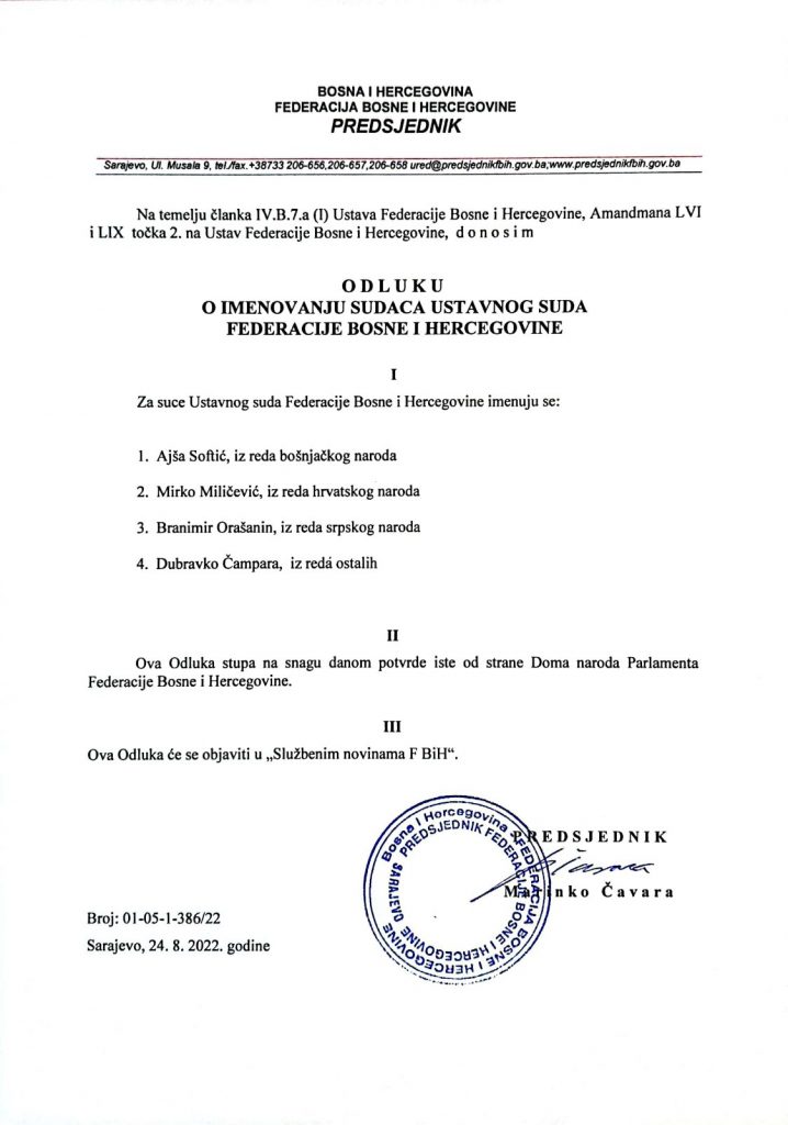 Dana 24. kolovoza 2022. godine, predsjednik Federacije BiH Marinko Čavara donio je Odluku o imenovanju sudaca Ustavnog suda Federacije BiH.