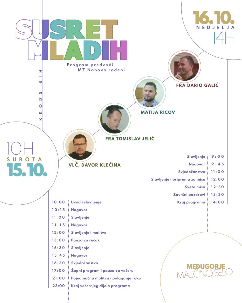Susret mladih KKODS BiH održat će se u Majčinom selu u Međugorju 15. i 16. listopada 2022.godine. Naime po prvi puta mladi KKODS BiH se okupljaju na jednom mjestu kako bi u zajedništvu slavili Gospodina i doživjeli osoban susret s njime.