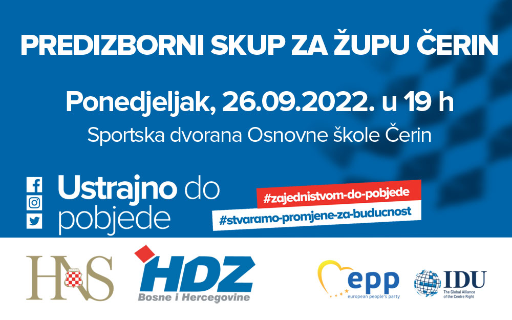 Predizborni skup održat će se večeras 26.09.2022. godine u Sportskoj dvorani Osnovne škole u Čerinu s početkom u 19 sati.
