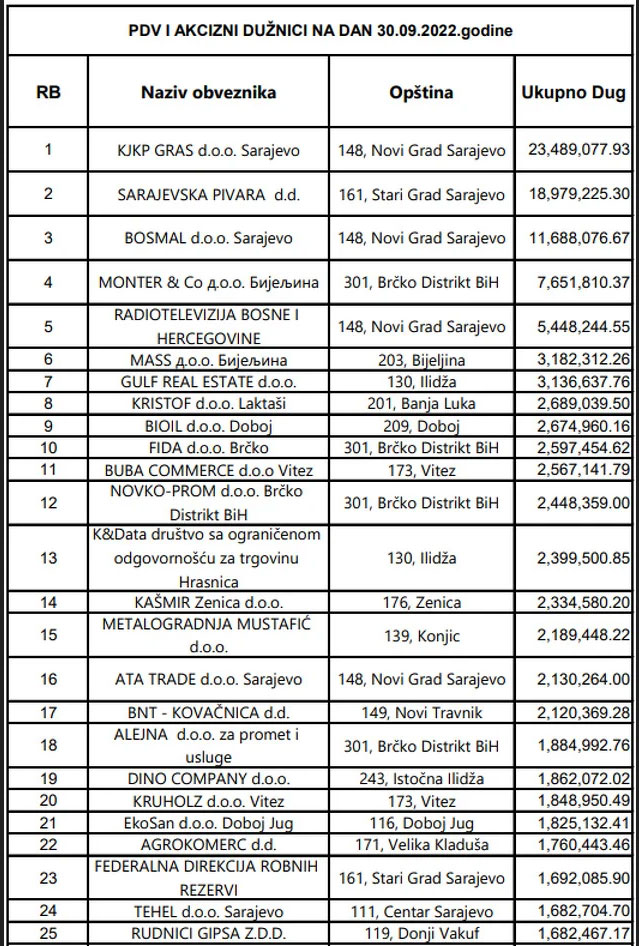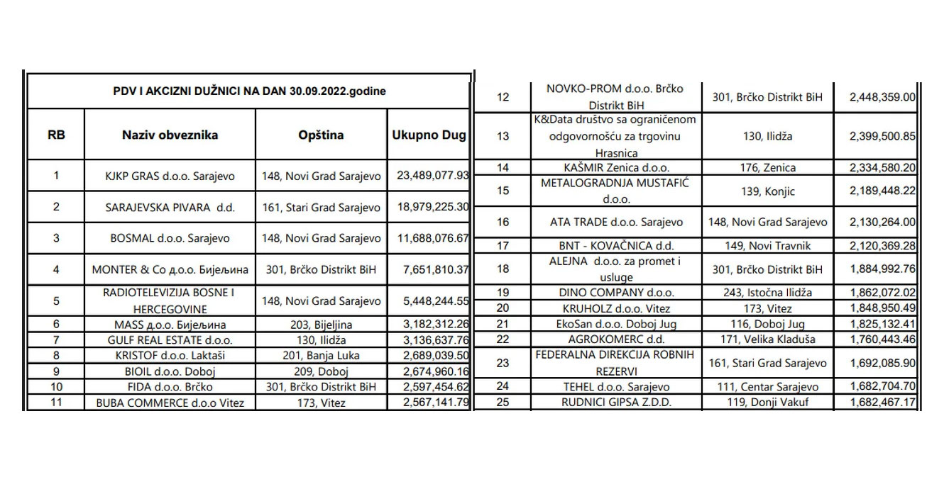 Pet najvećih PDV i trošarinskih dužnika su KJKP GRAS Sarajevo, (dug 23,4 milijuna KM), na drugom mjestu je Sarajevska pivara (18,9 milijuna), zatim BOSMAL Sarajevo, (11,6 milijuna) a četvrto i peto mjesto po visini duga zauzimaju MONTER & Co Bijeljina, (7,6 milijuna) i Radiotelevizija Bosne i Hercegovine, (5,4 milijuna KM), podaci su UNOBiH – prenosi Klix.ba.