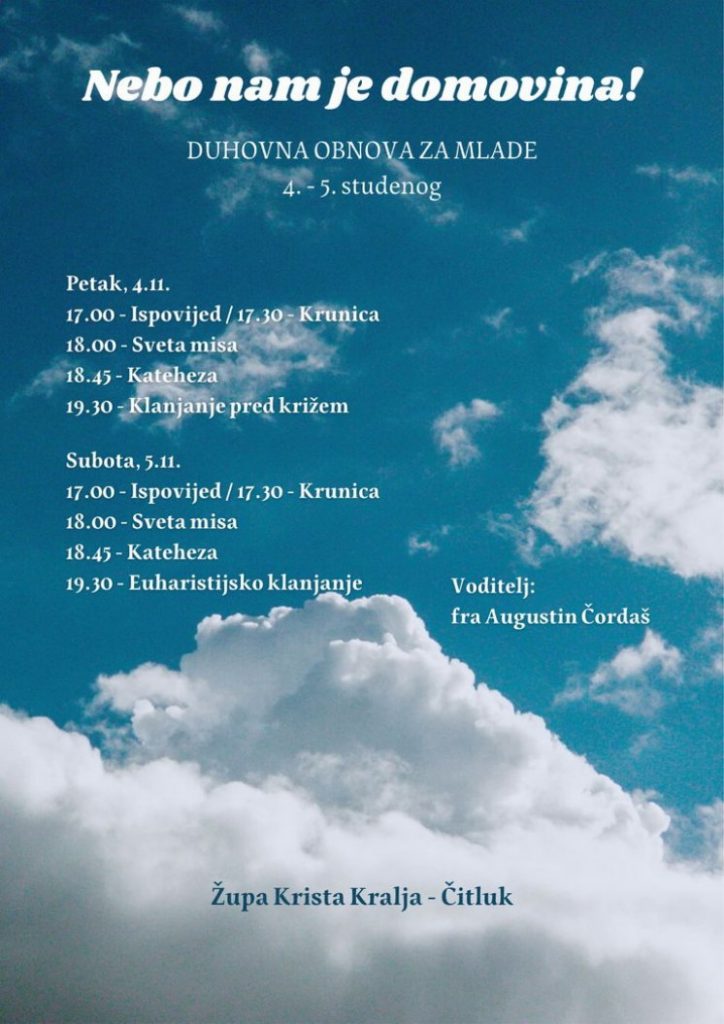 U župi Krista Kralja u Čitluku u petak i subotu 4. – 5. listopada 2022. organizira se Duhovna obnova za mlade na temu „Nebo nam je Domovina!“