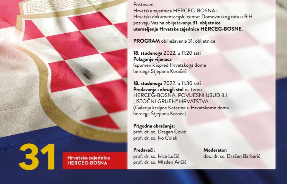 Obilježavanje 31. obljetnice Hrvatske zajednice Herceg-Bosne bit će u petak 18. studenog 2022. godine u Mostaru.