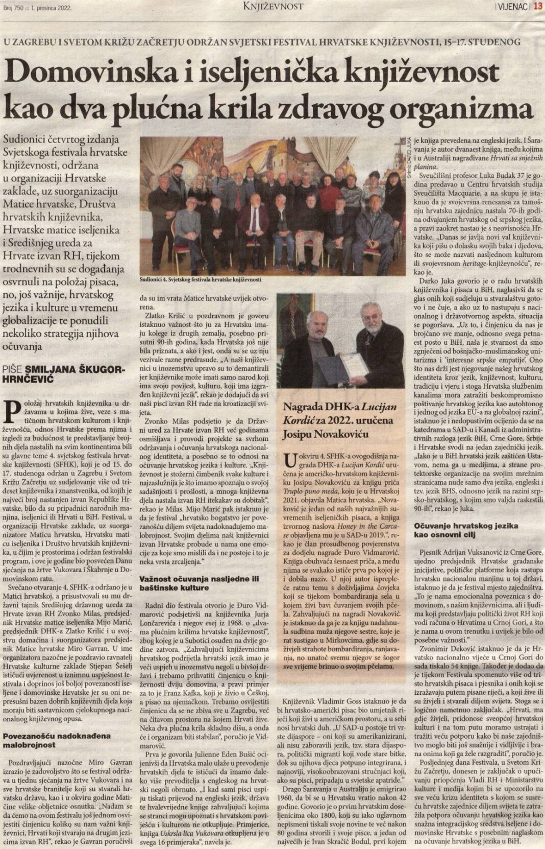 Prošloga mjeseca, od 15. do 17. studenog, Zagreb je ugostio IV. Svjetski festival hrvatske književnosti koji je, u zajedničkoj organizaciji Hrvatske kulturne zaklade, Matice hrvatske, DHK, Hrvatske matice iseljenika i Središnjega ureda za Hrvate izvan RH, okupio ugledne hrvatske književnike, akademike, lingviste i sveučilišne profesore iz Australije, Austrije, BiH, Crne Gore, Hrvatske, Italije, Kanade, Mađarske i iz SAD-a.