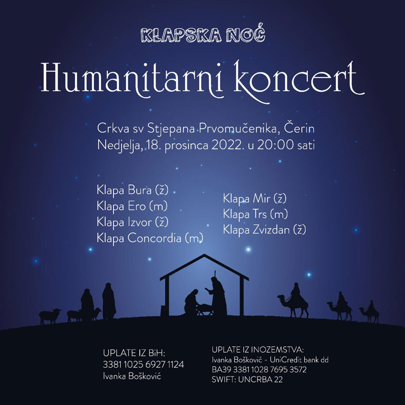 Pozivamo i vas da nam se pridružite 18.12. u 20:00h u župnoj crkvi na Čerinu, da još jednom pokažemo kako možemo pomoći posebno u ovom vremenu došašća kada smo posebno pozvani činiti dobro. Pomozimo jednoj mladoj osobi i pokažimo da duh Božića djeluje kroz nas – poručili su organizatori.