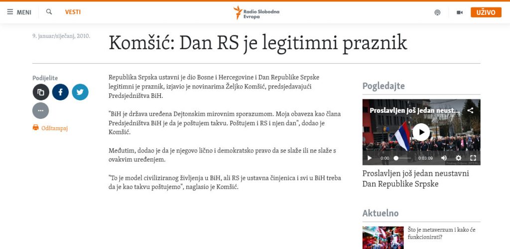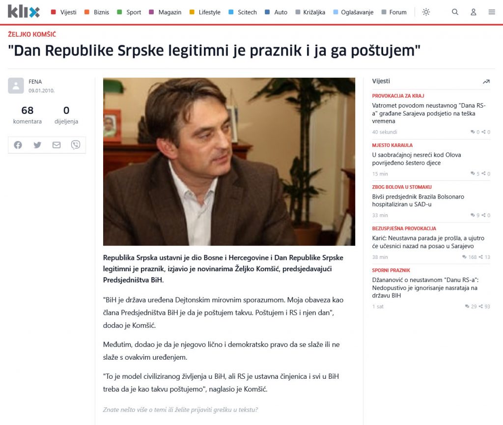 Republika Srpska ustavni je dio Bosne i Hercegovine i Dan Republike Srpske legitimni je praznik, izjavio je novinarima 9. siječnja 2010. godine Željko Komšić, predsjedavajući Predsjedništva BiH.